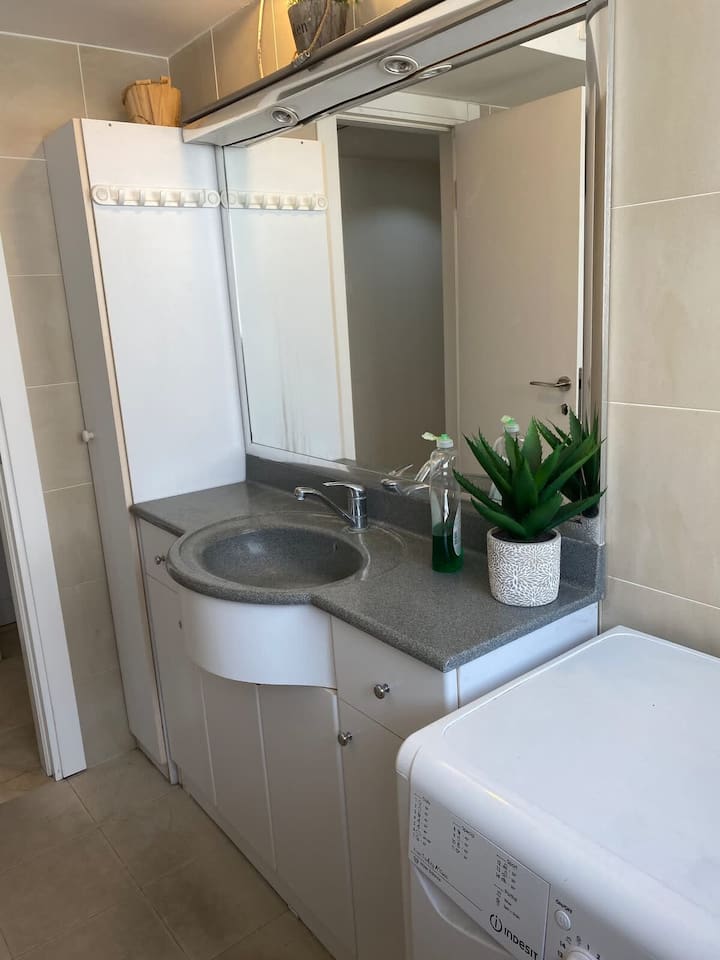 The apartment has two bedrooms! Master Bedroom: A generously sized with king-sized bed, and and bathroom for your convenience. Second Bedroom: Perfect for an adult couple or children. Equipped kitchen has all you need during your stay. Dining area for four. Private balcony: Great for savoring your morning coffee! Two full bathrooms: Both with a toilet and a shower!